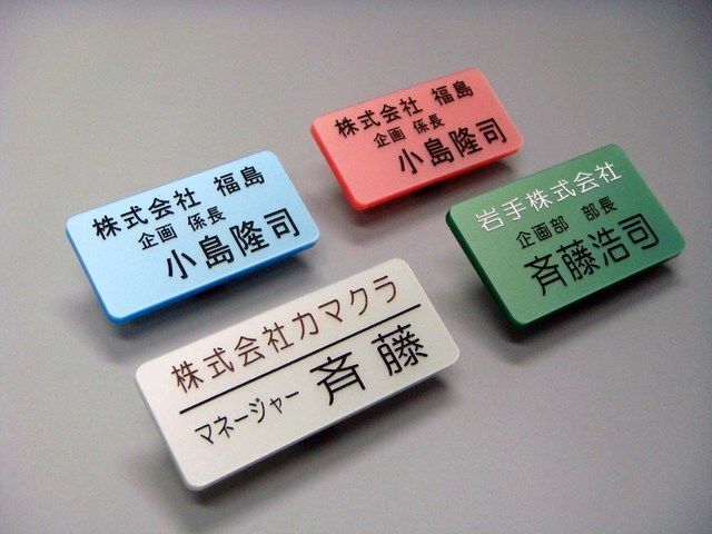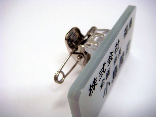 | 仕様 | サイズ タテ2.5cmXヨコ5cm タテ3.0cmXヨコ5cm タテ2.5cmXヨコ6cm 3種からお選びいただけます 重さ 7.4〜8.1g 素材 アクリル板 3mm厚 印字方法 彫刻 + 色入れ(3色まで使用可) 留め具 クリップ、安全ピンなど3種から選択 カスタマイズでマグネット留め具、回転式、等対応可 |