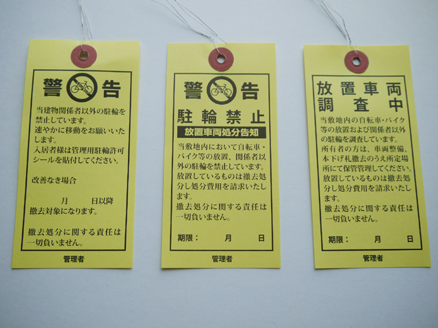 | 用途 | 放置自転車・バイクに取り付け注意、警告 撤去処分の際の事前確認用 |